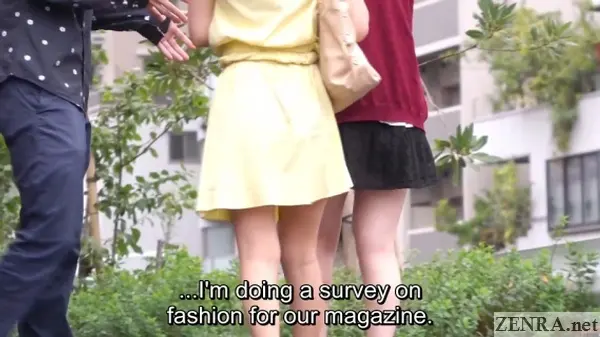 At its core HAVING SEX WHILE MY FRIEND WATCHES 2 *is* a nanpa title. It starts out on the street where we see each of HOT's resident pickup artists/JAV actors approaching pairs of women to take part in...you guessed it!...interviews and surveys for magazines. This seems to be a tried-and-true attempt that perhaps you all can try at home. All you need is a fearless friend to make the approaches and one or two more to act as film crew. Give it a shot!