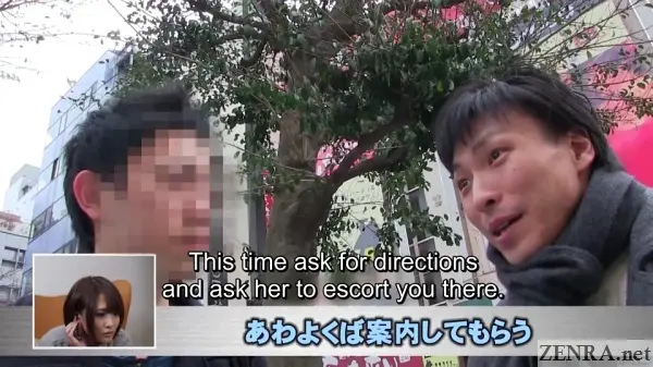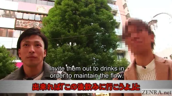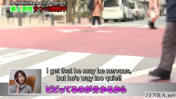 JUN DMC, the nanpa master of this title, doesn't explicitly say it, but nanpa really is a numbers game. As the three amateur men taking part soon realize, you really gotta go out there, push yourself, accept rejections, and keep on approaching girls. What you say isn't terribly important, but how you present yourself is! JUN even recommends sometimes just to approach women and tell them straight up that you find them cute and would like to take them to a cafe, restaurant, etc. Sometimes being direct with one's emotions can result in the best success. Besides, there's no need to beat around the bush! Guy approaches girl in public and the reasons are quite obvious.