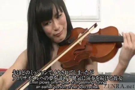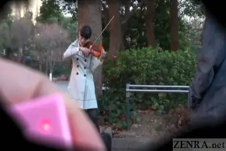 Emiri, the violinist, is about to experience a challenge like no other, but before her huge recital, the director takes her outside for a warm-up. In a public park somewhere within Tokyo, she slides a remote control vibrator deep inside her and begins an impromptu performance of Air on the G String while a small, but dedicated crowd forms. Her violin's case is facing inwards hence the guilt of not giving a tip is certainly a plus. With avid appreciators of classical violin gathered around this kinda-sorta Japanese AV star, the fun with the vibrator begins...