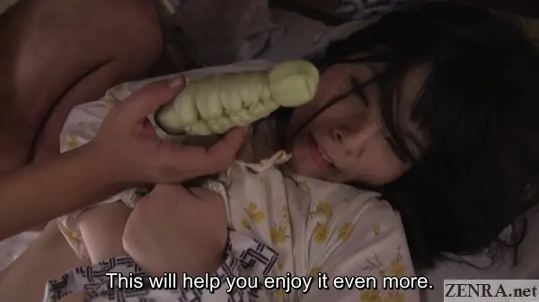 The use of a soaked taro as a dildo is believed to cause an immense feeling of arousal. It's not an aphrodisiac, but it's believed to enhance the quality of sex and may have been used often by elites throughout Japan's Edo Period. Here, it's used on AI UEHARA who seems to find it makes her body hot and her sexual gratification from it remains questionable.