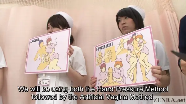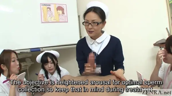 The vintage smut mag technique obviously isn't enough as the head nurse notes that current research has found a link between extreme and prolonged arousal and optimal sperm production. Thus, all techniques such as the Mouth Suction Method, the Prostate Massage Method, the Intravaginal Method, and more are done thoroughly over a very extended period of time. The patients nearly lose their minds to chronic ecstasy from the situations they're placed in.