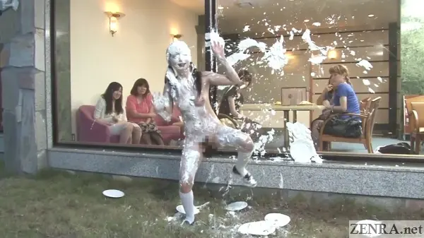 TRANQUIL CAFE SHAKEUP follows the format conceived in LIBRARY though this time around, the biggest difference is the variety in scenes and the patrons. One thing I at least found *slight* issue with in LIBRARY was how the patrons for the most part mutely watched the insanity happen in front of them. There wasn't too much interaction. It really was as if they became the audience for a bizarre impromptu stark naked perversion performance. In CAFE, we see many more instances of the naked perverts breaking the fourth wall by interacting with the patrons. One scene even has one take the lead by literally taking the leash and inflicting her own pervert thoughts upon a wild woman who ran in, tore off her clothes, and cried out something shocking (second to last scene).