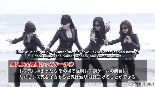 I really am blown away by how well this ROCKET release ended up being. It even has CGI! Good quality CGI too! You get your high-tech island map ala Battle Royale complete with various challenges that all predictably end with sexual and taboo penalty games (hey, it's a JAV so sex is a given!). You can kind of consider STARK NAKED TAG an spin-off of the PRIVATE PARTS GUESSING GAME series. They're shot by the same director for the same company though RIRI KOUDA is swapped for a very brusque female leader who does her job very well. Said leader commands a small army of 'lesbian hunters' (that almost certainly features REMI MIURA and AYAKA KANOU). Seeing one of them strip stark naked for that 'kissing among the waves scene' was one of the highlights of this title.