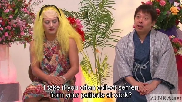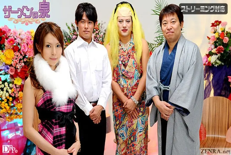 THE FOUNTAIN OF SEMEN was released to coincide with the "thank gosh it's over" spiritual boom that was plaguing Japanese prime-time TV in the late 2000's. I don't know how it started nor why it was a thing, but for a few years, you had these slightly older "gurus" reading the "auras" of people and giving them advice. FOUNTAIN is a parody JAV movie about one of the more popular series (that still is on today believe it or not) called Fountain of Auras. The most notable cast member--and someone you may have seen on a recent trip to Japan and remained awfully confused about--is AKIHIRO MIWA. Now in his seventies (or eighties?), he cross-dresses and wears an unnaturally blonde wig. If you ever wanted to see a JAV that parodies him (all four of you!), then here ya go!