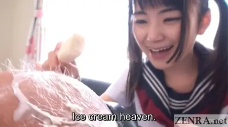 Each of the five scenes featured mostly the same sex acts done mostly in the same order, but the situations around them were somewhat varied. Our favorite scene was the first which starred a very moe-inducing TSUNA KIMURA who played the role of naive schoolgirl perfectly. This one featured some bizarre ice cream/bald head worship followed by increasingly erotic acts of sexual curiosity. Fans of 'sexual non-sexual' may like this scene the most.