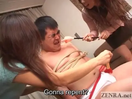 Going back to GUTS, they're almost a maker without a bread-and-butter fall-back as they dabbled in so many genres. One of which are light femdom CFNM ones like today's update, THE BOUND EDUCATION OF A MASOCHISTIC MAN. The title pretty much sum up what happens in each of the four scenes that make up this 60 minute affair: a pair of clothed women bind a masochistic man followed by teasing him (mainly by tickling) and then give him a handjob.