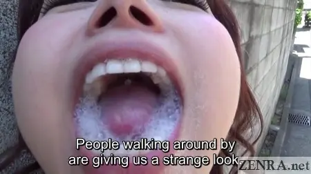 The second scene in STICKY SEMEN storage was yet another fun example of combining gokkun with public exposure--or in this case public embarrassment: TSUBAKI KATOU treated a very happy male volunteer to a blowjob with a gokkun finish before walking outside with RUSHER MIYOSHI. Along with a hand-held camera, he had TSUBAKI perform her kinda sorta namesake outside amidst passersby.