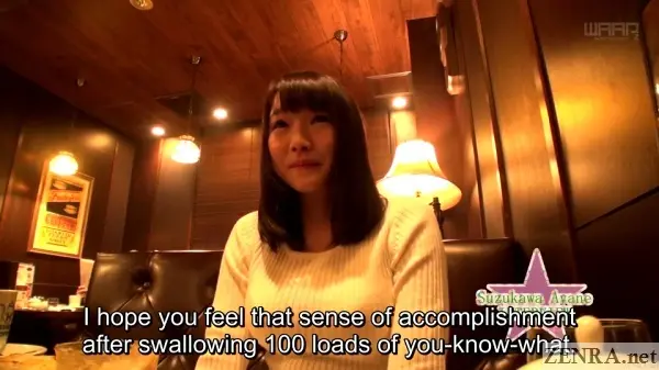 Now with the AYANE SUZUKAWA's charming vocal idiosyrancies out of the way, let's talk about this magnum opus of a title, AYANE SUZUKAWA SWALLOWS 100 LOADS. Originally 'OVER' was going to be included as the last update from this series starring AIRI NATSUME I believe went past 100. Then there was GOKKUN VENUS with MIKI SUNOHARA that got to around 107. VENUS, unlke today's update and the AIRI one was directed by KIRIN whereas WAAP's former cum-centric director KURUMI ICHINOSE handled this one. As we've noted before, KURUMI has left WAAP on amicable terms and he still seems to be staying within his gokkun comfort zones, but now as a freelance director (mainly with SOD).