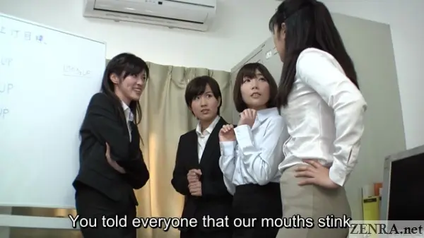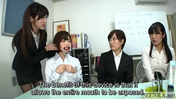 The last two scenes were examples of interviews gone very, very wrong: the boss of a dental supply company has her female job hopefuls try out cheek retractors leading into some surprising oral-themed lesbian play. Things get extra salacious in the fourth scene which releases a lot of pent-up sexual frustration in the form of an intense four-person Japanese lesbian orgy right in the office! These two scenes features SARA YURIKAWA (ARISU CHIGASAKI) , IORI SAKURABA, YUUKO OOHASHI, and the return of MAYUKA MOMOTA.