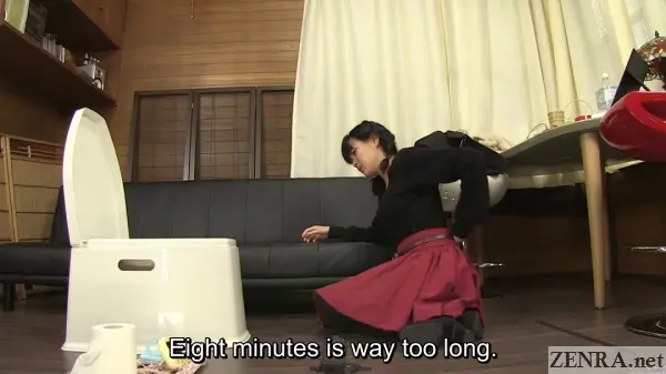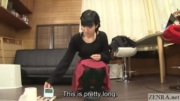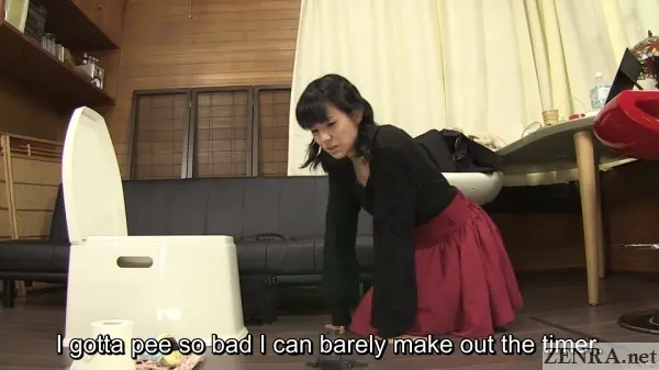 The second timer though is hidden in a portable toilet located behind the actress. She's instructed to raise the toilet seat after the 16 minute timer chimes. Of course she's thinking that she's then free to finally led her impressively full bladder run riot, but within the toilet is timer #2 along with instructions to set it for an ADDITIONAL 10 minutes!