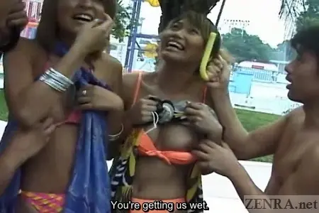 The Outdoors Exposure of these two Japanese gyaru admittedly starts out relatively slowly with nipple peaks and flashes at the water park. Due to less than favorable weather conditions, the turnout of actual customers is lacking, but the park remains open for business. The initial public nudity in this production was very tame, but unlike other examples, Rara and Mai's indecent outdoor adventures are as real as they get. With actual customers around, there's only so much one can risk and these two really push it.