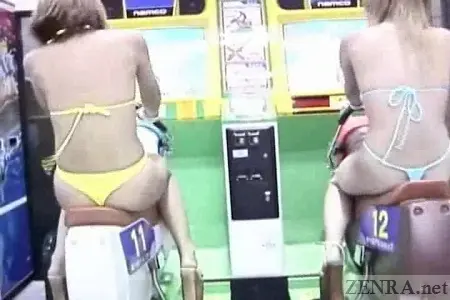 Further water park adventures show both Japanese gyaru getting frisky in a purikura booth (short for picture club -- aka those photo booths where you can take adventurous pictures with friends and dates where everyone looks stellar due to auto-airbrushing). While remaining in their revealing bikinis, they play various games in the arcade located at the water park's entrance. To begin, there's a racing game that ends up with both topless while other arcade-goers watch on in equal parts awe and confusion. Pleasure down south commences on a strange derby game complete with vibrating seats which is followed by a rousing round of millennial techno while 'dancing' (stepping) on a DDR mat all in a real, public arcade.