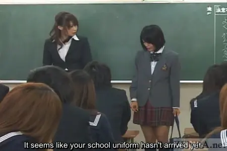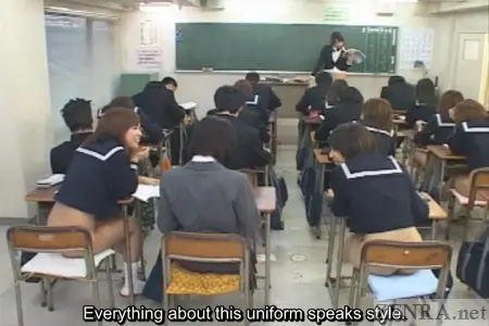 As soon as Sakurai-san is settled in her new desk, her bottomless female neighbors begin commenting about her very stylish uniform. They remark on how much better it is than theirs oblivious to the fact that she is fully clothed, dress, panties, and all the while their most intimate regions are exposed for everyone. Strangely, Sakurai doesn't bat an eye at the bizarreness the female teachers and students at this school subscribe to.