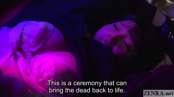 BLACK MAGIC SACRIFICE begins with camp, but with straight-forward romance taking center stage for the bulk of it (aside from the last few minutes at the end). The story: AI UEHARA is a high school student who has a crush on her teacher, Oki-sensei. Oki, while handsome with a big head and square jaw, is also something of a weirdo. His wife? Lost in a car crash years ago. His obsession? Bringing her spirit back via occult rituals involving sex with schoolgirls. His next target? AI! One day after class, he's tutoring her in English and goes in for a poor man's attempt at seduction that features him wielding pseudo black magic wizardry. Obviously it doesn't work, but due to her crush, AI simply plays along which ignites their highly risky relationship.