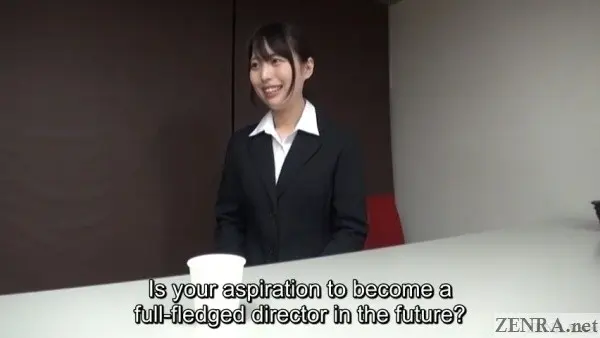 The GOGOS NEW FEMALE EMPLOYEE series is somewhat like the famous SOD series, but with slightly less--OK massively less--actresses in each release. Most, actually, only star one though the one we showed last time and today's feature two (this time the extra female coworker is only in one scene and mainly observes). The star of the show if AYA MIZUNO whom we last saw in a fantastic private lesbian movie she shot with her real life friend. Apparently, she submitted that to GOGOS and eventually decided not only did she want to work for a JAV company, but to do whatever's needed to become a full-fledged director.
