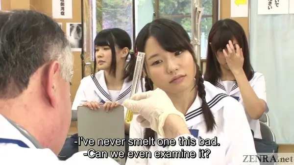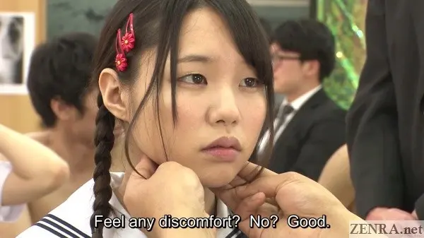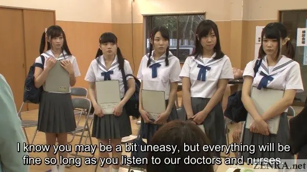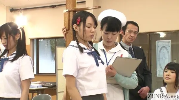 NEW STUDENT PHYSICAL EXAMINATION DAY 2, like the first one, is a good JAV movie. It's almost but not quite a great JAV movie. On one hand, you've a huge cast of five young actresses, two or three female nurses and doctors (played by older women who often take on clothed roles in JAV movies), a trio of doctors played by actors we've all seen many a time, and a huge cast of other extras as well. SADISTIC VILLAGE may not be the most popular studio when going by their minuscule internet presence both in Japan and abroad, but the quality of their titles is incredible. They're just too busy creating great movies to worry about all that fan outreach.