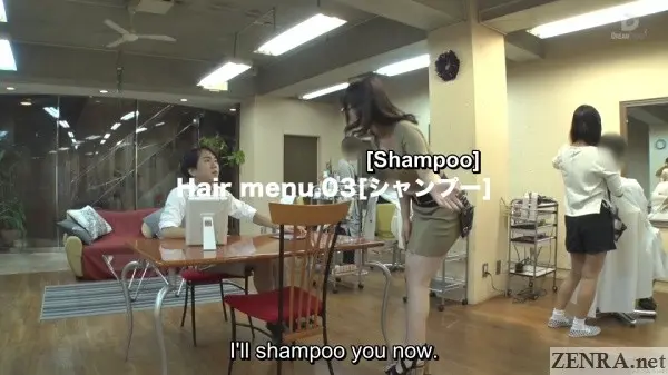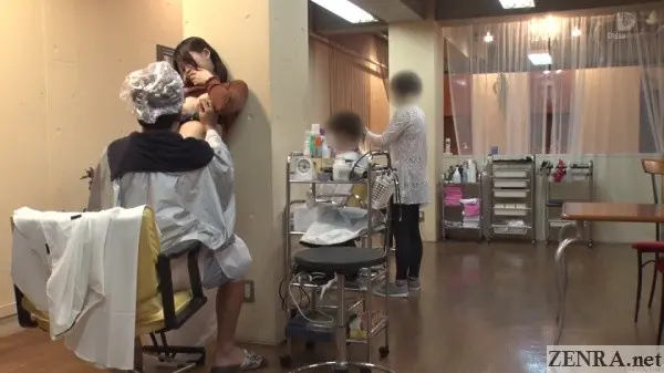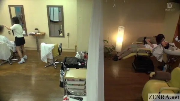 What goes on in this Tokyo-based salon probably pushes reality way past its breaking point. On one hand, I'm certain just like TEMPTATION DENTIST this was filmed on location. Yes, some crazy hair salon owner who may be a huge JAV fan (or just friends with DREAM TICKET's production staff) actually has been lending out his shop for adult video filming. One of these days he's going to get caught unless his staff is all in on it and given what I've seen about certain parts of Tokyo, this may be closer to the truth.