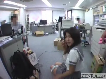 The most memorable thing about this movie is not the multiple times YUUKO had milk squeezed out of her teats. That was cool if you're into it. What really struck me as awesome was the masturbation scene. Normally women masturbating on their own is something I'm not too interested in, but the way it was done here was the best if you're a 2000's JAV otaku. YUUKO, dressed as a schoolgirl circa 2001, was brought up to the actual GUTS office and was instructed to pleasure herself in front of their staff. If you're a fan of JAV movies that take place in real studio offices, then by all means check out that scene. I've been to quite a few studios and whether it's good or bad to say, they still look pretty much identical. There are rarely beautiful women at JAV studio offices. Perhaps interviewing a new actress before hiring her, but that's about it. Usually it's a surprisingly quiet sausage party. If you're lucky, there will be posters up and you may see all their movies on display.