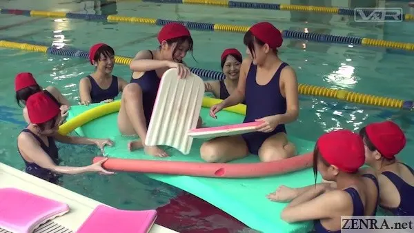 Anyhoo, enough history and mild critique and more on OUTDOOR SCHOOL ADVENTURE REVERSE GANGBANG, probably the best 'minimum' JAV movie ever shot. This stars the who's who of those types of actresses at the time though sadly the cast list was never published. From what I can tell, we've MARIE KONISHI going head to head with RINA HATSUME. They even star in a great pool handjob scene together in the second half that's well worth checking out. I've no idea how the actor was able to cum while his lower body was submerged. Fan service? Extreme concentration? Or just being serviced by two extremely pretty and innocent JAV stars masquerading as naughty schoolgirls. Your call.