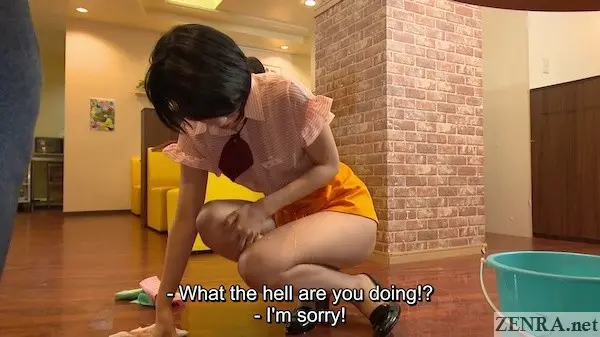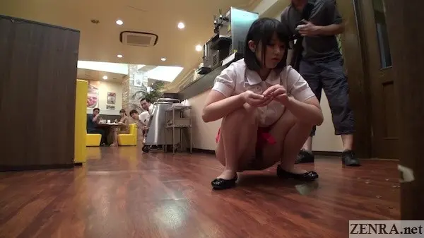 The concept repeated in both scenarios is pretty much the same: new hire, uniform violation, bottomless work environment. Have her engage in all the yucky and strenuous tasks regular employees don't want to do like changing light bulbs, chasing after rodents (yes, some AD brought a pet hamster or something on set for this), and other tasks that give real customers an eyeful of their exposed legs, butts, and gosh knows what else. This is the kind of embarrassment that exceeds ITAZURA ONSEN. At least there many customers are also in various states of undress; here, we're smack dab in a crowded restaurants and they're not onsen guests, but new hires doing their best to make a good first impression.