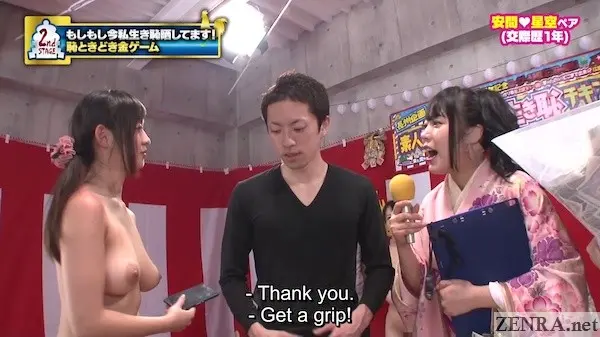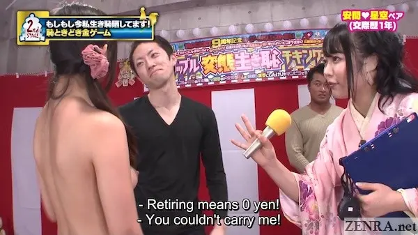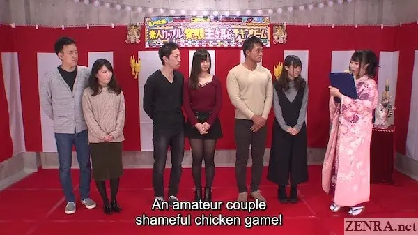 Today is not a 'risky' game show. It's a game show, yes, but it's all about couples wanting money and since it's New Years, we go big. Very, very big. Welcome to ROCKET's first (and so far only) stark naked CHICKEN GAME. For those not in the know which I am going to assume is everyone reading this, here is how this type of game is defined in Wikipedia: "The game of chicken, also known as the hawk–dove game or snowdrift game, is a model of conflict for two players in game theory. The principle of the game is that while the ideal outcome is for one player to yield (to avoid the worst outcome if neither yields), the individuals try to avoid it out of pride for not wanting to look like a 'chicken'. So each player taunts the other to increase the risk of shame in yielding. However, when one player yields, the conflict is avoided, and the game is for the most part over." They go into great detail about this and it's truly fascinating so if you've time and temporary low libido, check it out.