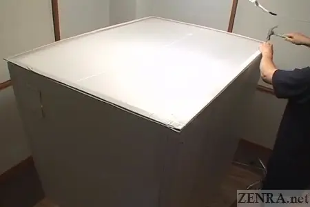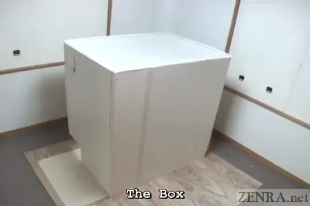 The apartment itself is nondescript. Devoid of most furniture, but well-lit. Centered in one room adjacent to a foreboding stairwell is a hastily-constructed box. It's not too tall, but hoary in color and not the kind of place one would prefer to reside in. In fact, it's just large enough for someone of a small frame to dwell in for short periods of time...perhaps a day...a day nonstop perhaps?