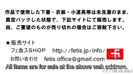 This was a hefty title with a pretty long running time, but it never lagged. Translating it into English was a joy due to optimal audio conditions. Enjoy complete and exclusive English subtitles that don't skimp on grammar and time-coding. Also, devout maniac fans of Japanese AV, FETIS releases, and Yui Kyouno can head on over to their online store and purchase actual used clothing and toys used in their productions! Admittedly, it's not cheap, but it would be the ultimate limited-edition collectors item. Yui Kyouno's outfits--including her three-day dirty panties which sold for approximately $300USD!--are all sold out, but there are other neat items of note from future FETIS-ZENRA releases.