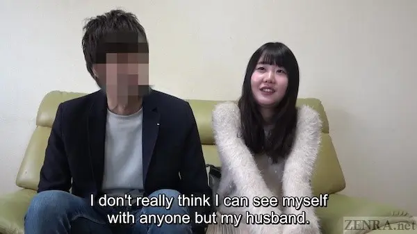 The gist of HAVING SEX IN FRONT OF MY HUSBAND INFIDELITY EXAMINATION involves said married couple meeting with the director. Their problem? The husband. Apparently, his manhood is just too big making for sex that is uncomfortable. Throughout an impressively long and detailed interview pushing 30 minutes (yes, it's that long, but interesting so don't skip through!), we get a deep dive into their nocturnal married couple woes. Towards the end, having sex while the director observes remotely is suggested and they carry through with it...