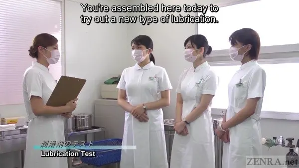 Scene 2: Lubrication Testing. Nurses gather bottomless to try out a new type of lubrication before one engages in medicinal intercourse with a patient (while everyone watches!).