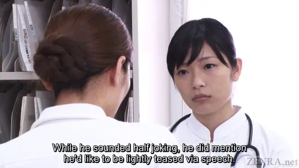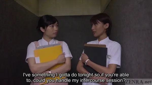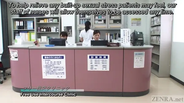 Scene 5 (and 6): Intercourse Outside of Patient Treatments. The sex itself is more what you'd normally expect but that it happens in the hospital and in the first half in front of nurses makes it worthwhile. It works well because even though within this world the nurses are engaged in almost nonstop sexual stimulation, they are supposed to keep their emotions in check. Here, they can go wild.
