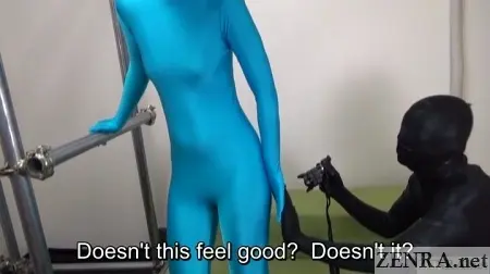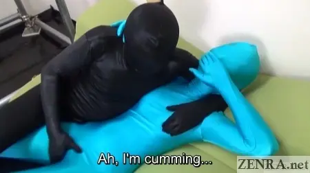 Although touching is not allowed at these events, the lure of a major payday is enough and she allows the cardinal rule to broken. Touching turns to fondling and fondling leads to mutual masturbation with some very novel ways of sexual release that involve contact, but through ZENTAI suits. The fan's suit even has an erection sock which she eagerly massages and strokes until he orgasms.