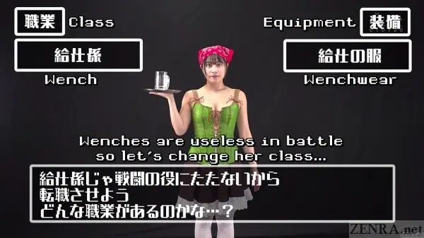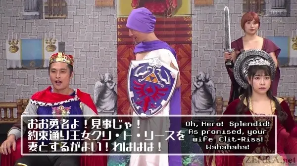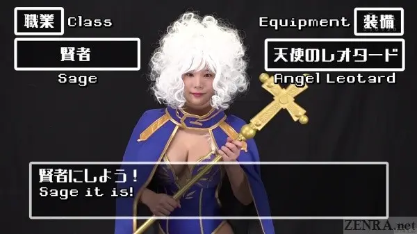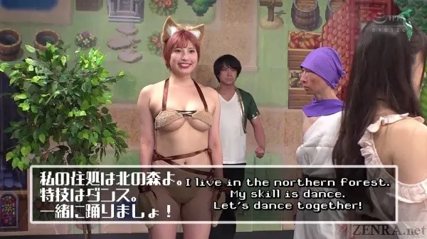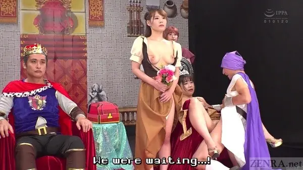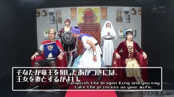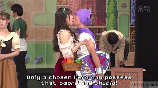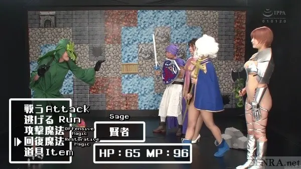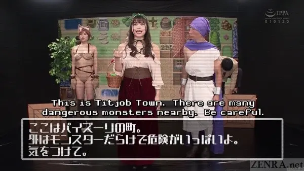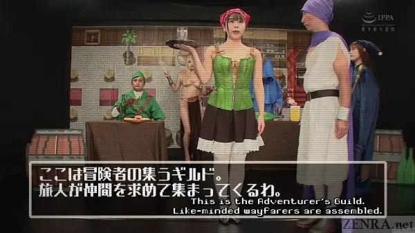 In fact, one of the potential minuses ROCKET uses to its benefit is casting: RPGs with big, lush world require many characters, but anyone who has played RPGs back in the day knows with storage on cartridges being so limited, video game makers must make cuts to fit all that data. Most commonly is by re-using sprites so 'flower girl' in 'quaint village' suddenly becomes 'princess' even though it's obvious it's the same sprite profile but perhaps with different colors. ROCKET casts three actresses who all play a variety of roles: MIZUKI HAYAKAWA (who looks great with short hair and seems to be aging incredibly well) as cute cat girl dancer/palace guard/female warrior, RINO YUUKI as HERO's fiancee/sorceress in the Adventurer's Guild/sage, and MIO NOZAKI as wench/princess/martial artist. All nail their parts and when the glitches begin due MOBUSUKE's libido taking center stage, it works surprisingly well. Sure, they each only have one or two lines per scene, but when the play begins...