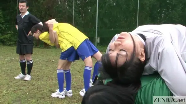 ZENRA SOCCER is all about a team of college students (?) or high school students (?). We're not entirely sure as it's not provided, but given AV's overall fixation on youth, we'll say it's the latter. The soccer team wants to not only make it to the nationals, but win, and their highly skeevy principal played by KENTA KUDOU has little faith that their coach, RIKA MINAMINO, is up to task. Thus, he entrusts a strict coaching staff led by the surprisingly martinet PIERRE KEN who slams down his metaphorical iron fist on dissidence. When he's in charge, the world around him is all about by-the-book soccer and those who disobey are met with highly embarrassing and very erotic penalties.