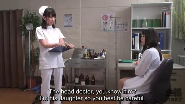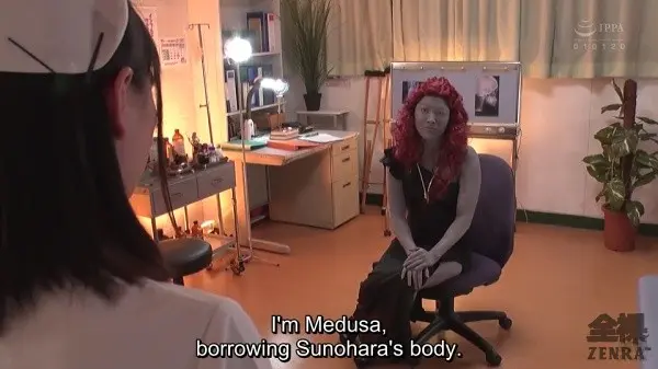Alongside MIKI, we have CHIHARU SAKURAI whom in a previous update also played a lesbian though then just an innocent student one. Here, she plays a bitchy nurse (really, that's what the role called for) whom due to her daddy owning the clinic, seems to have free reign to dominate over most anyone. MIKI, an internal medicine specialist whom recently got engaged to another doctor in the clinic, is in for a rude awakening as marriage proposals are shattered because of Nurse Chiharu operating mischief behind the scenes. A nervous breakdown or an actual talking stuffed snake toy is anyone's call, but soon enough, she transforms into a mentally cracked incarnate of Medusa and wants to enact revenge...by totally lezzing out.