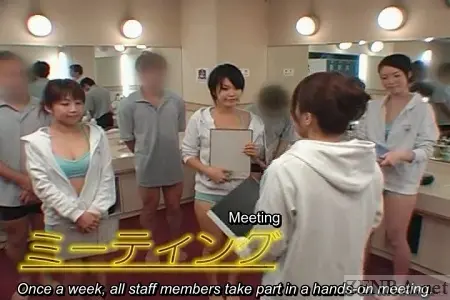 In this special new employee edition of Sauna Ladies, we see many instances of a true on-hands learning experience such as bikini-uniform-clad trainees taking notes while watching their instructor explain with visuals how to correctly wash a customer's penis and testicles using a gentle yet extended pumping motion. As they get in close to see how fast and how firm to hold the hard cock, the stimulation from the customer's point of view goes into emergency overdrive causing him to embarrassingly ejaculate all over the teacher's hands and after he finishes, she calmly pets his now-shrinking manhood explaining to the students that accidents such as this happen on a regular basis.